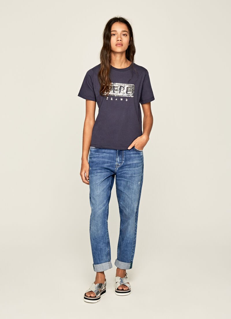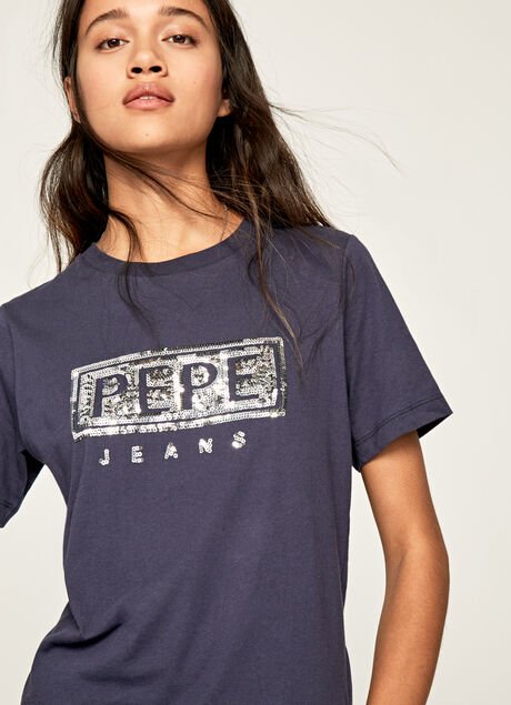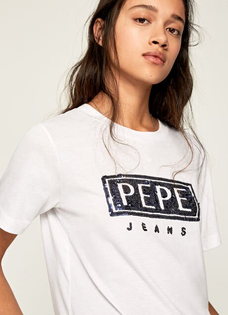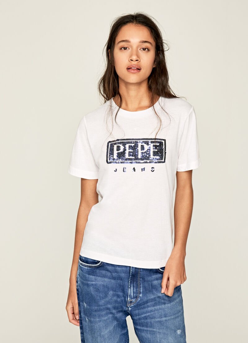 Camiseta manga corta tejido suave, detalle lentejuelas en pecho.