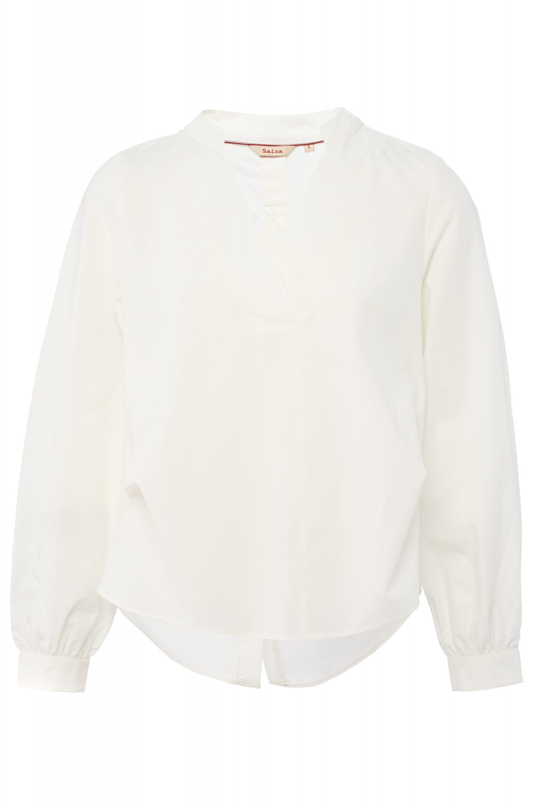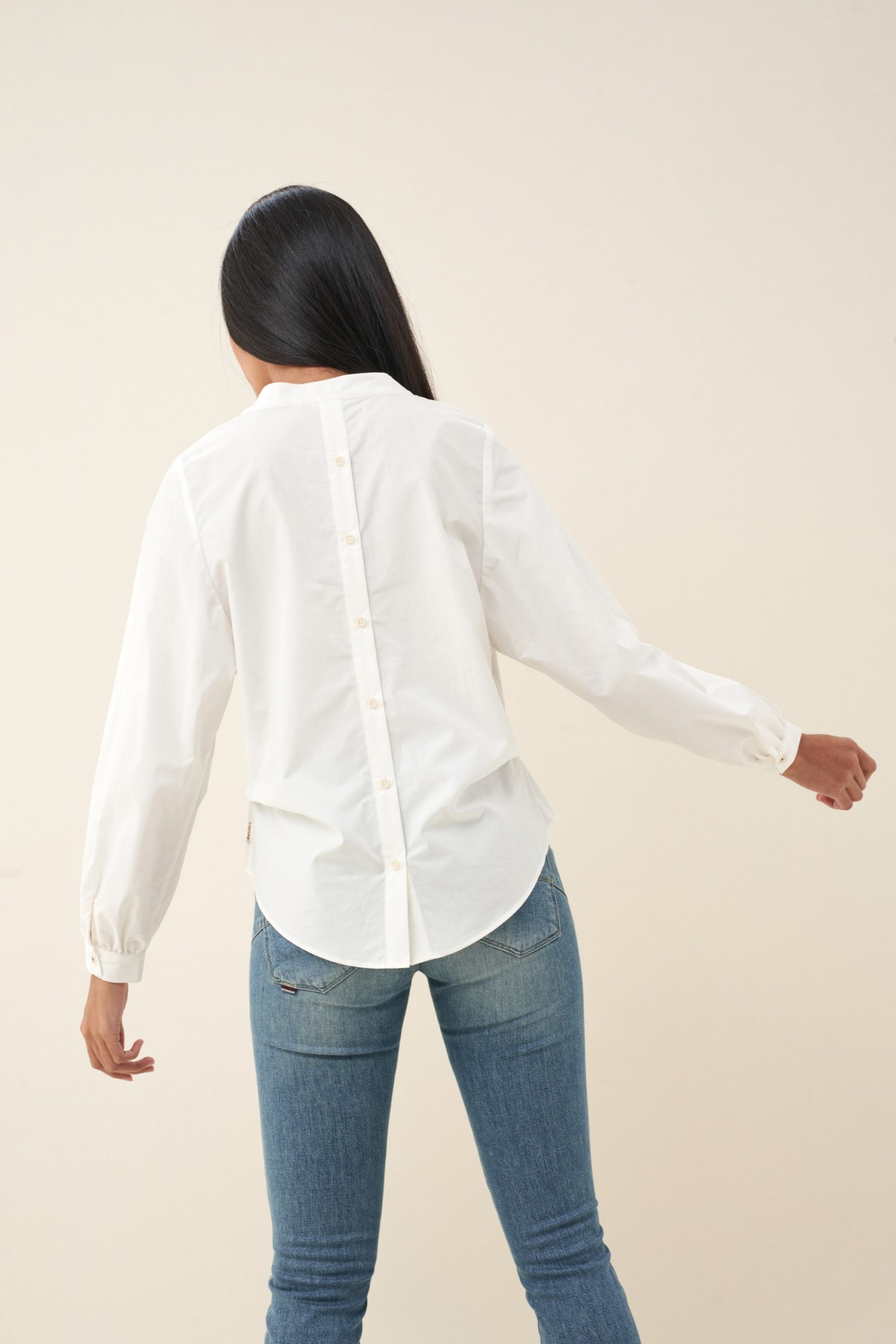 Camisa blanca lisa con cuello en v, abotonada en la espalda.