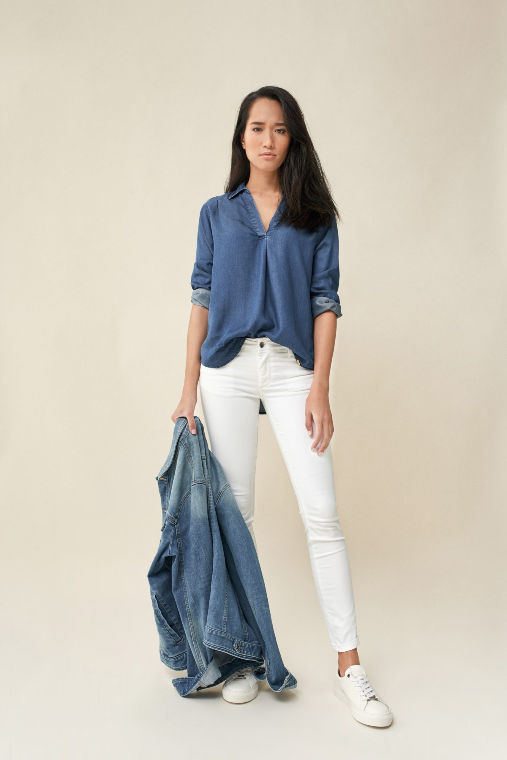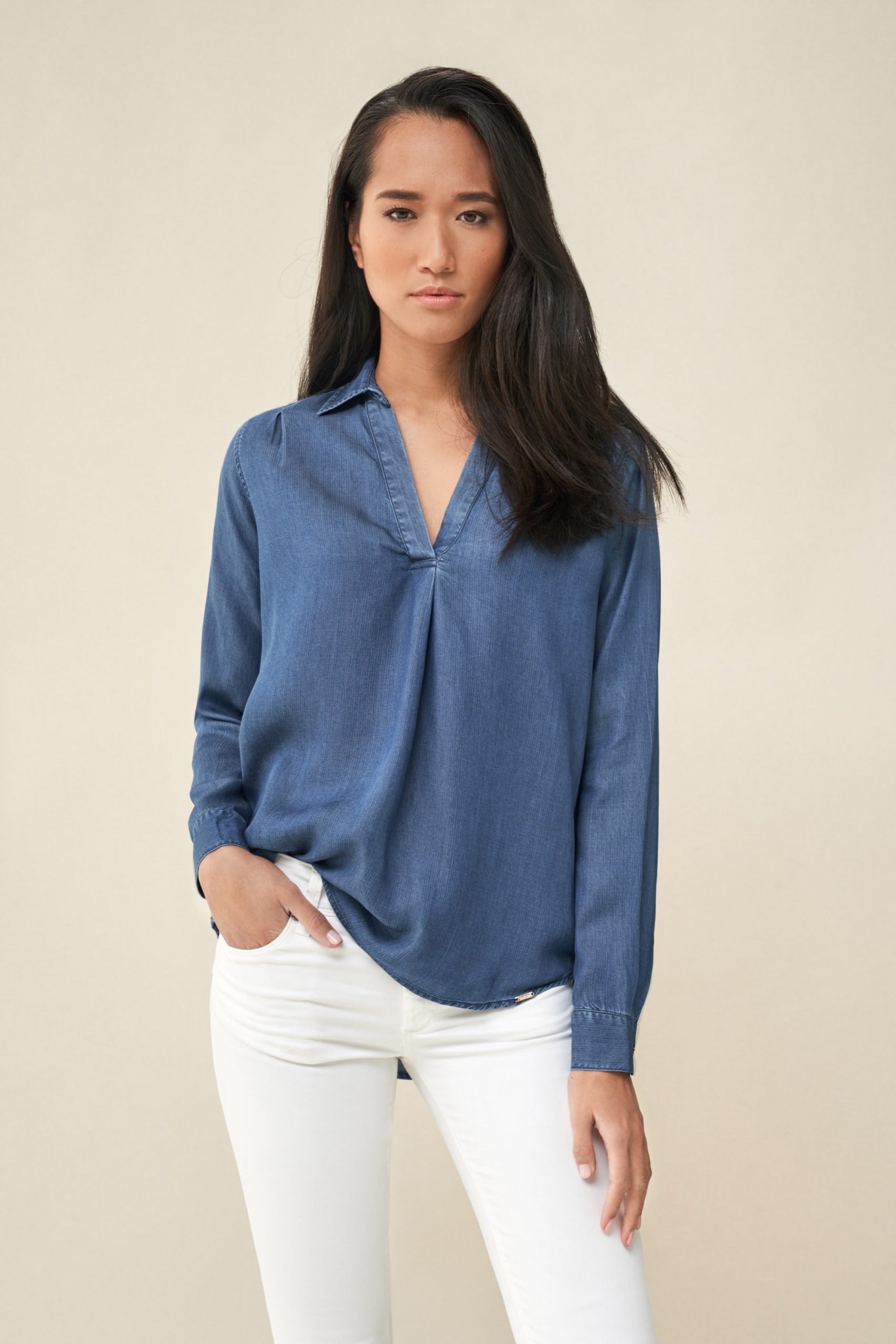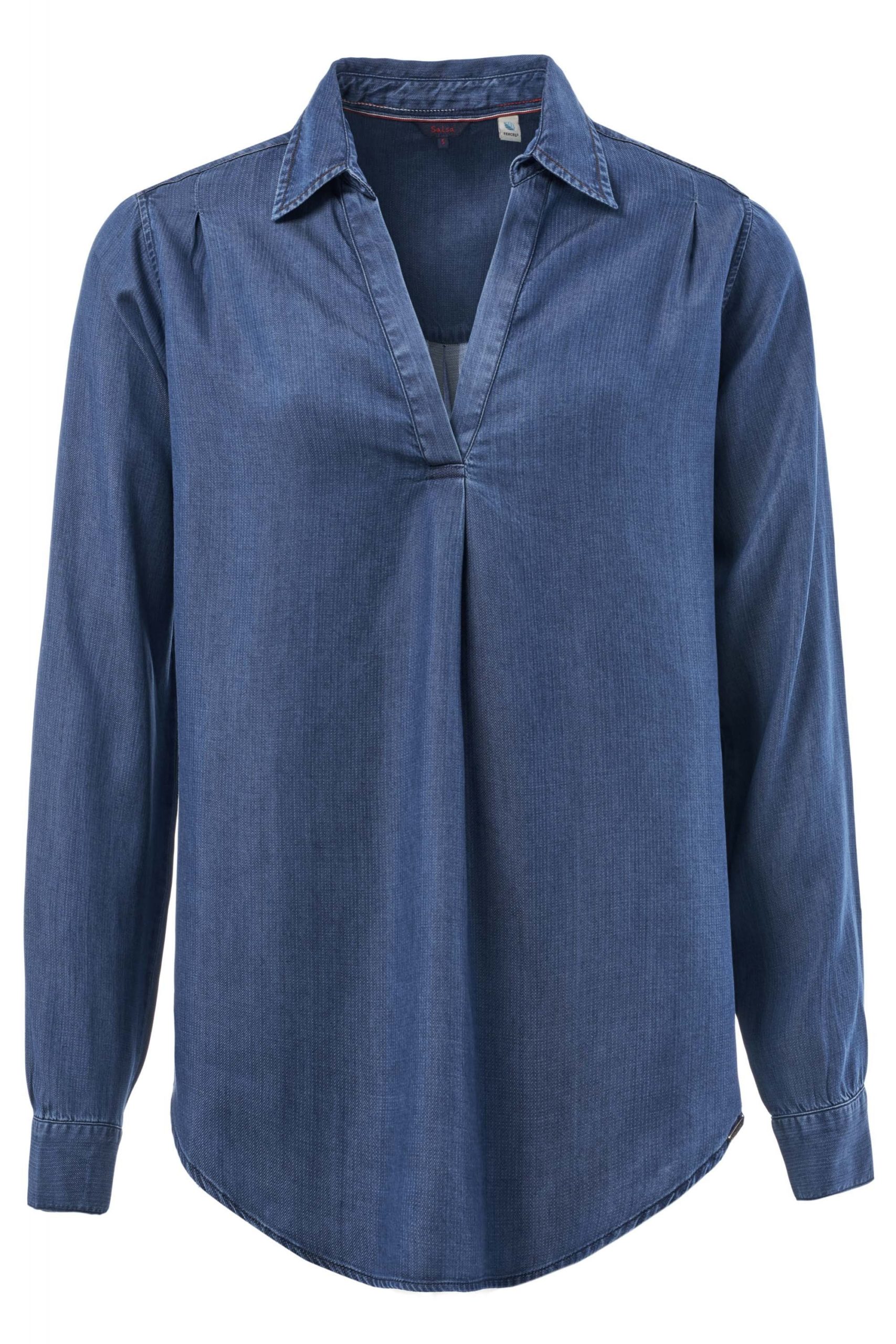 Camisa jeans con cuello en v, en tejido tencel.