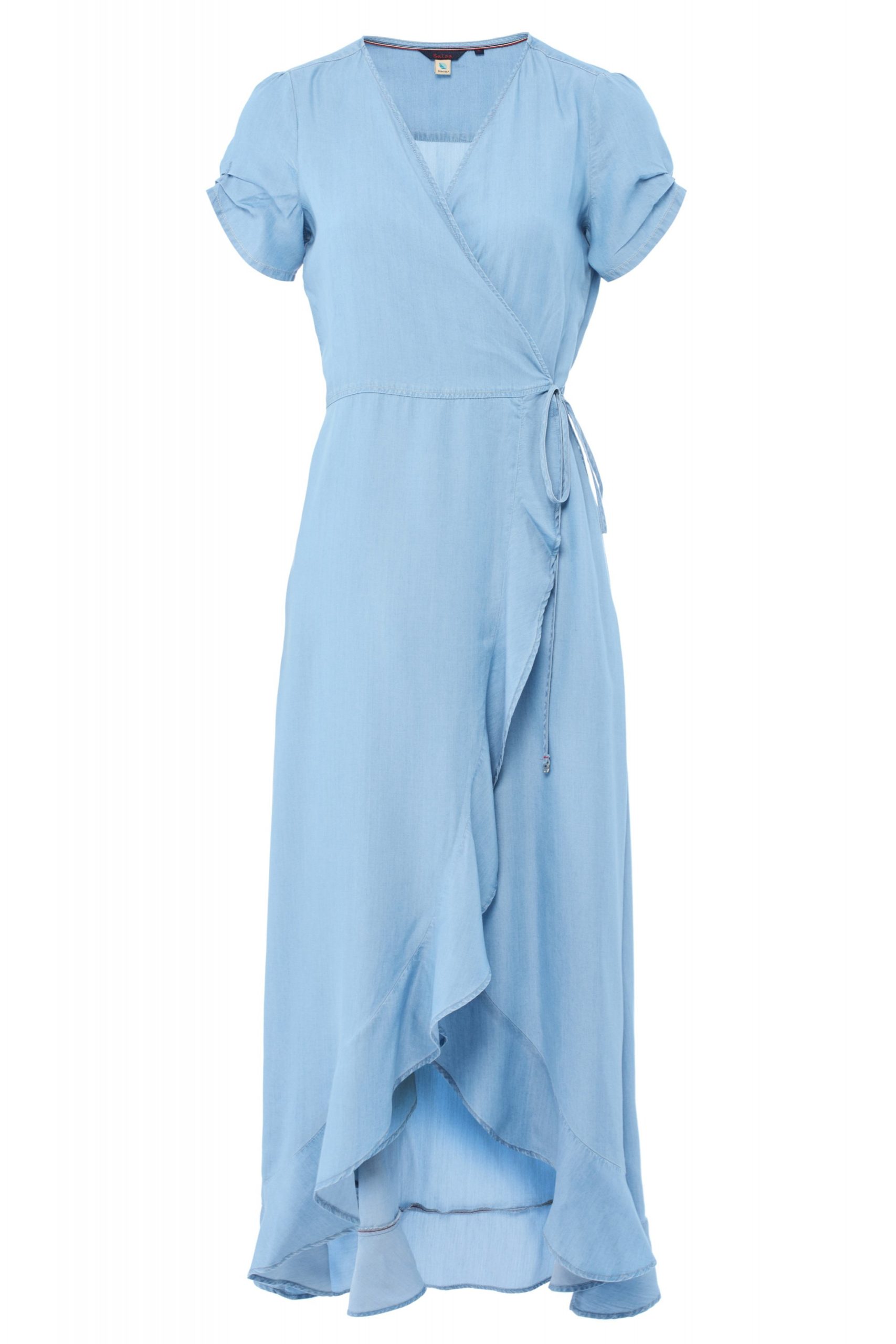 Vestido con volantes, cruzado y realizado en tejido tencel con aspecto jeans.